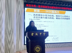 接着,我校从品老师、南京九中教研组长胡吉蔚老师开设讲座。从品老师开设讲座《高中生批判性思维的培养途径探索》,通过丰富的教学实例和深入的教研思考,向全体数学同仁们阐释了什么是批判性思维、为什么要培养批判性思维。通过“一个中心、六个途径”,结合平常自身教学经历和对近十年高考题的具体研究,展示了如何用苏格拉底问答法,将课堂变革为“问题”驱动的思辨课堂。胡吉蔚老师开设讲座《教学评一体化深耕——高一备课组校本资料精准化编写的探索》,她从2025届高三备考工作的复盘谈起,将高三习题类资料编写方式灵活运用到高一新授课和微专题教学中,向全体老师呈现了九中学案和课时练习的编写流程。同时,面对新入职年轻老师的大量增加,展示了九中基于Deepseek的新教师编制学案的探索途径,教会了老师们在合理设问中,让人工智能更好赋能日常的教育教学工作。