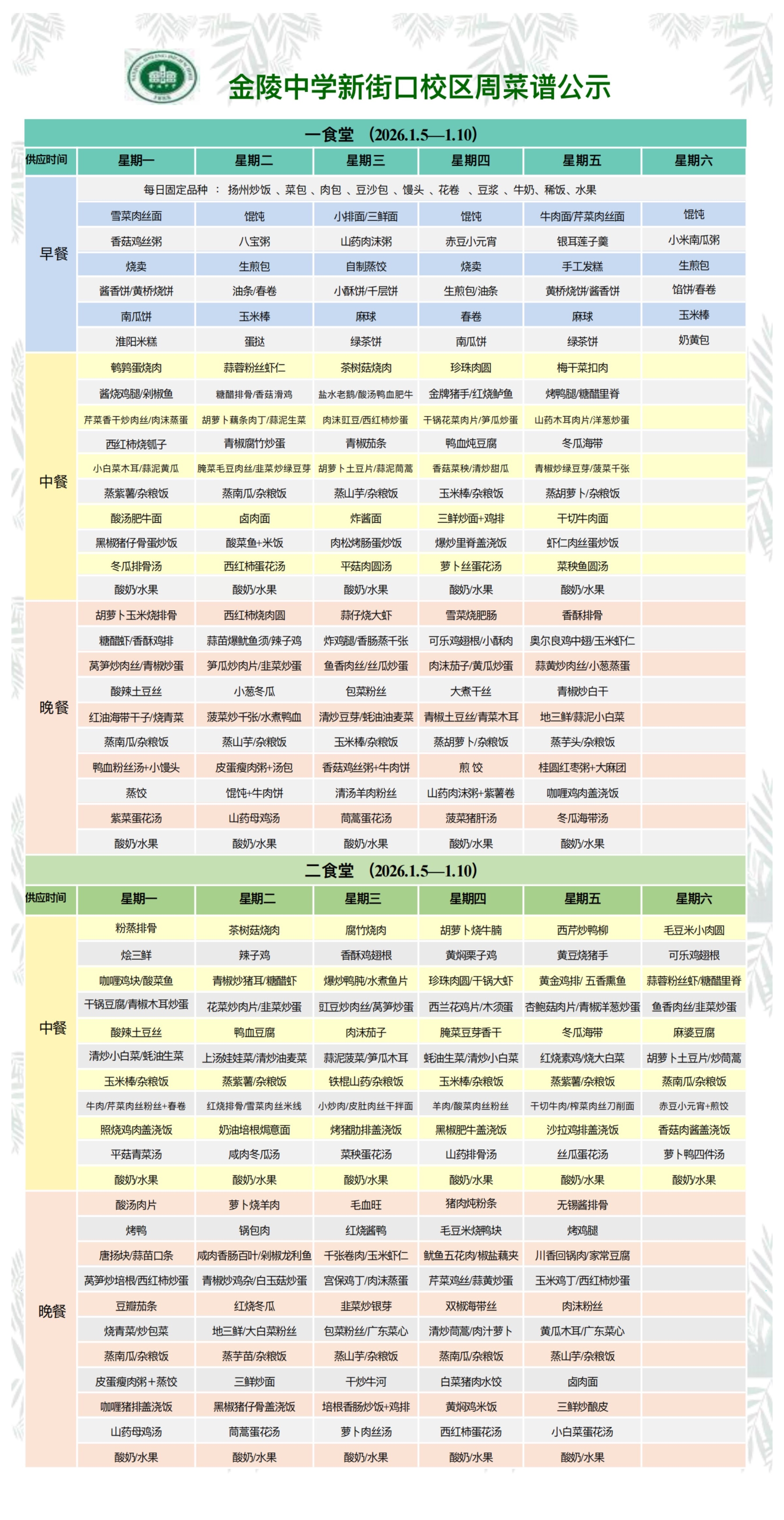 新街口校区一周菜谱(2026.1.5—1.10)