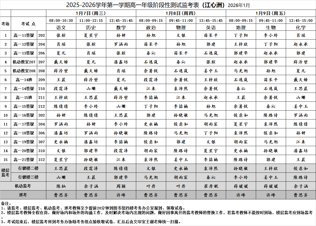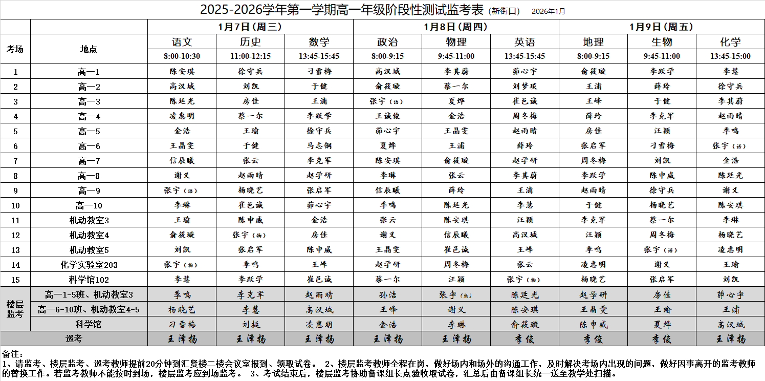 2025-2026学年第一学期高一年级阶段性测试监考表