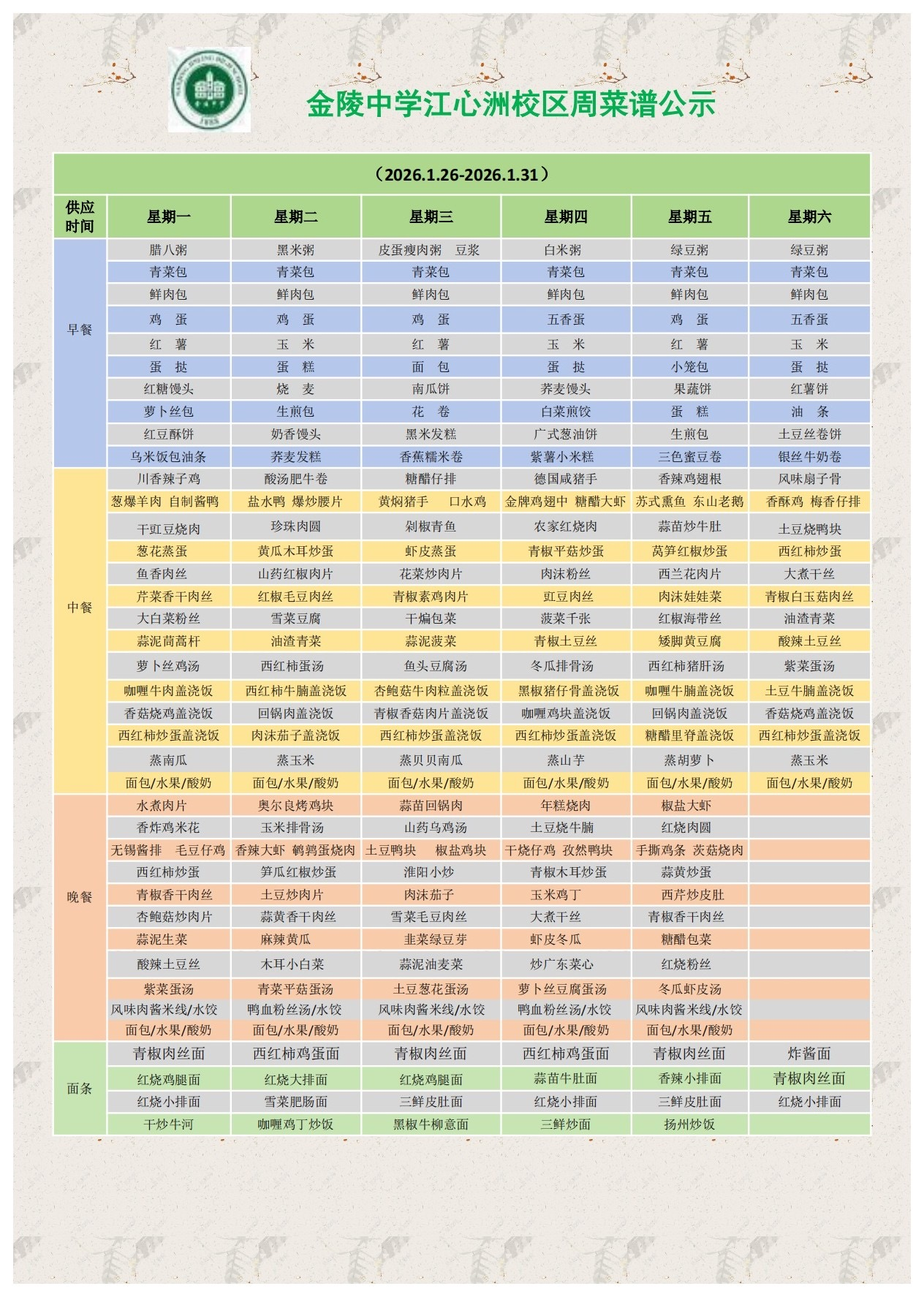 江心洲校区一周菜谱(2026.1.26—1.31)