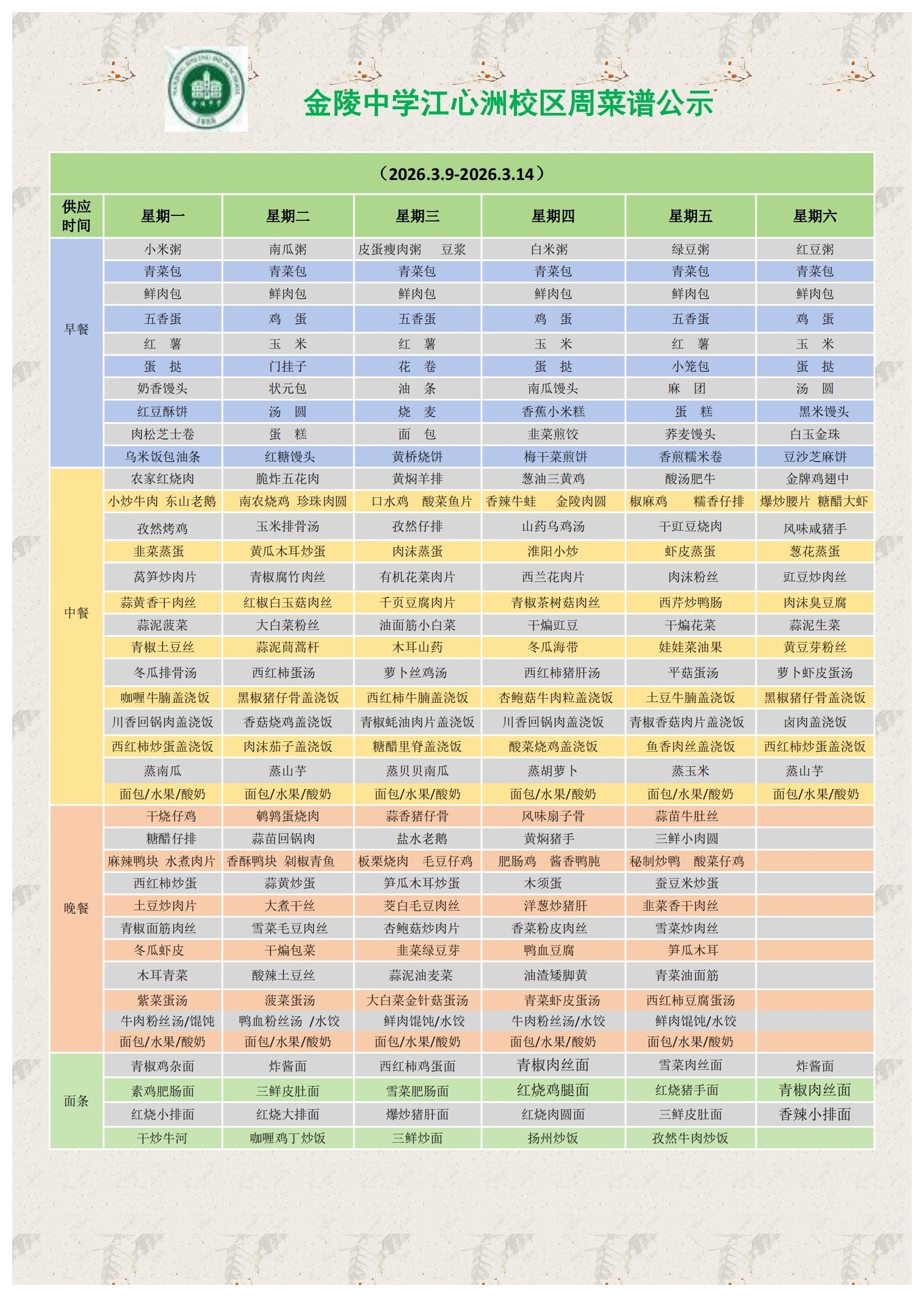 江心洲校区一周菜谱(2026.3.9—3.14)