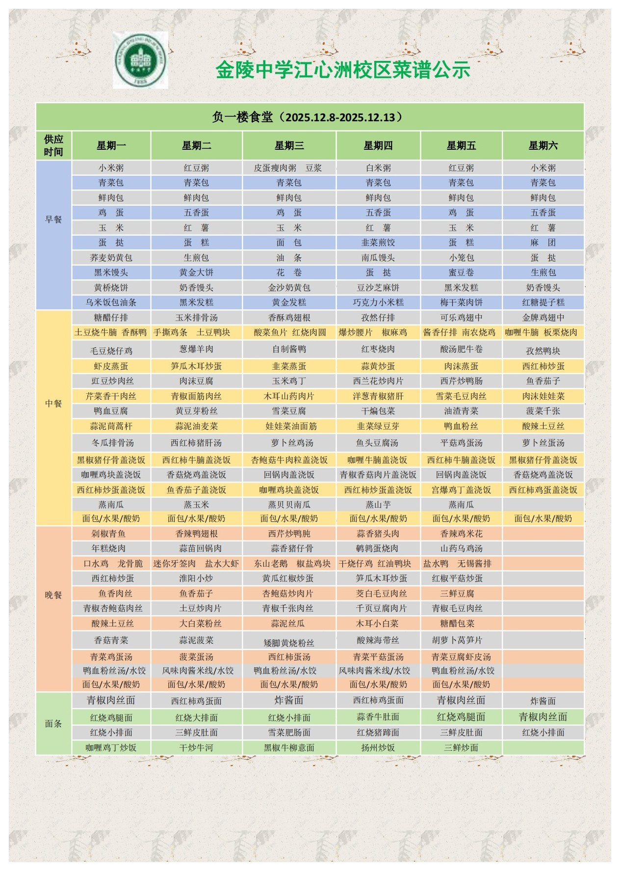 江心洲校区一周菜谱(2025.12.8—12.13)