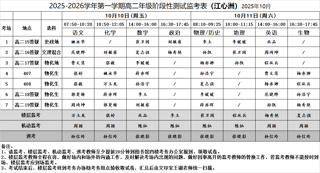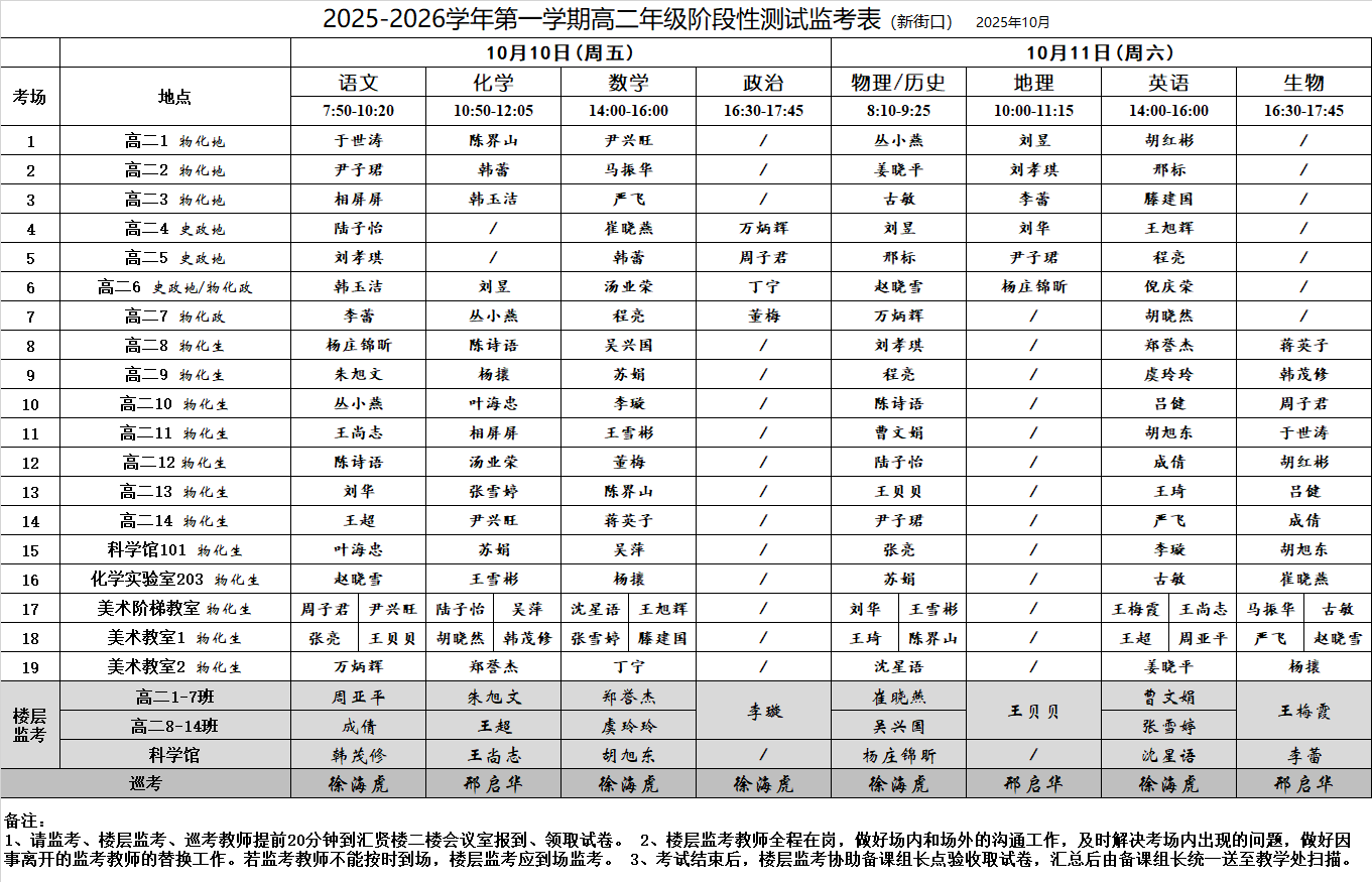 2025-2026学年第一学期高二年级阶段性测试监考表