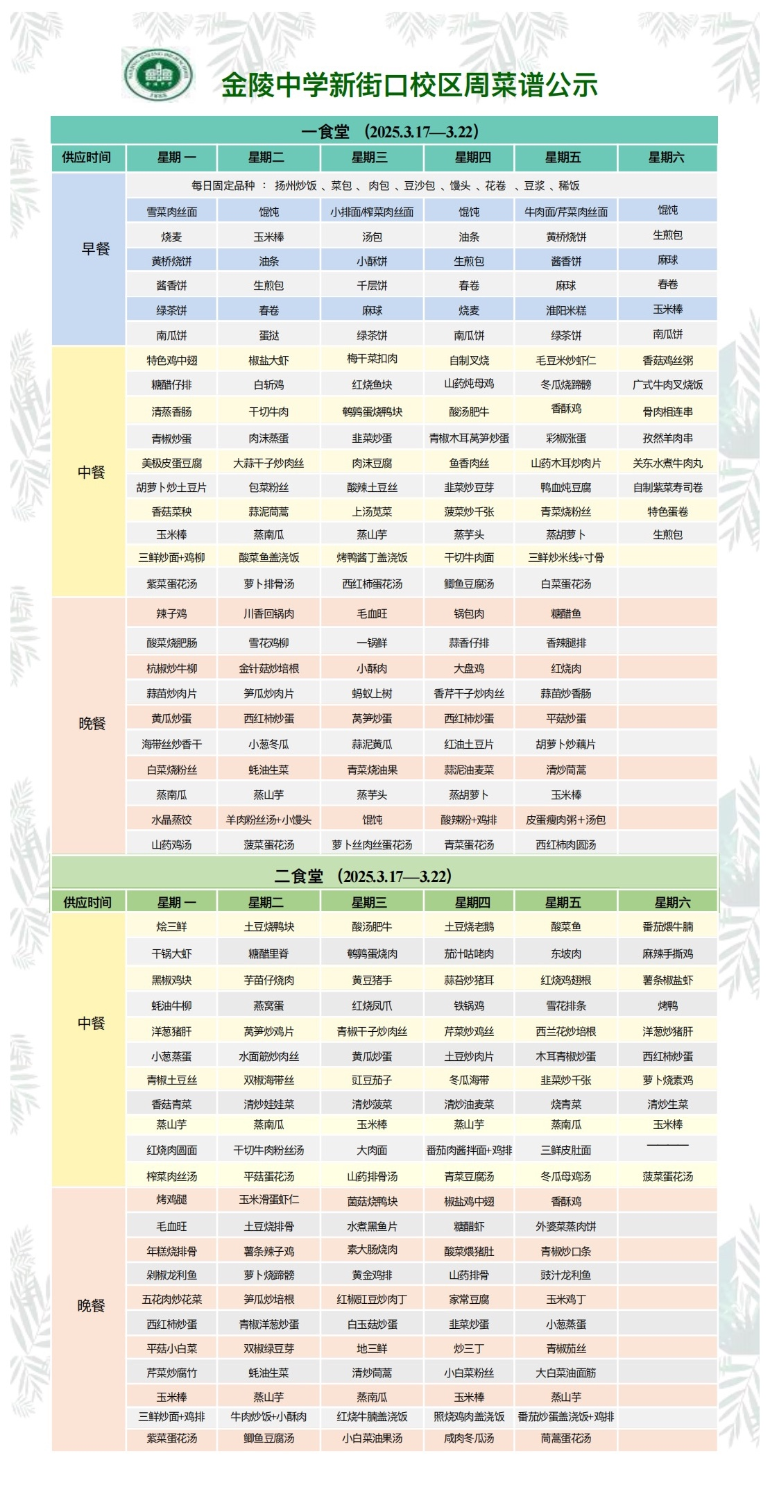 新街口校区一周菜谱(2025.3.17—3.22)