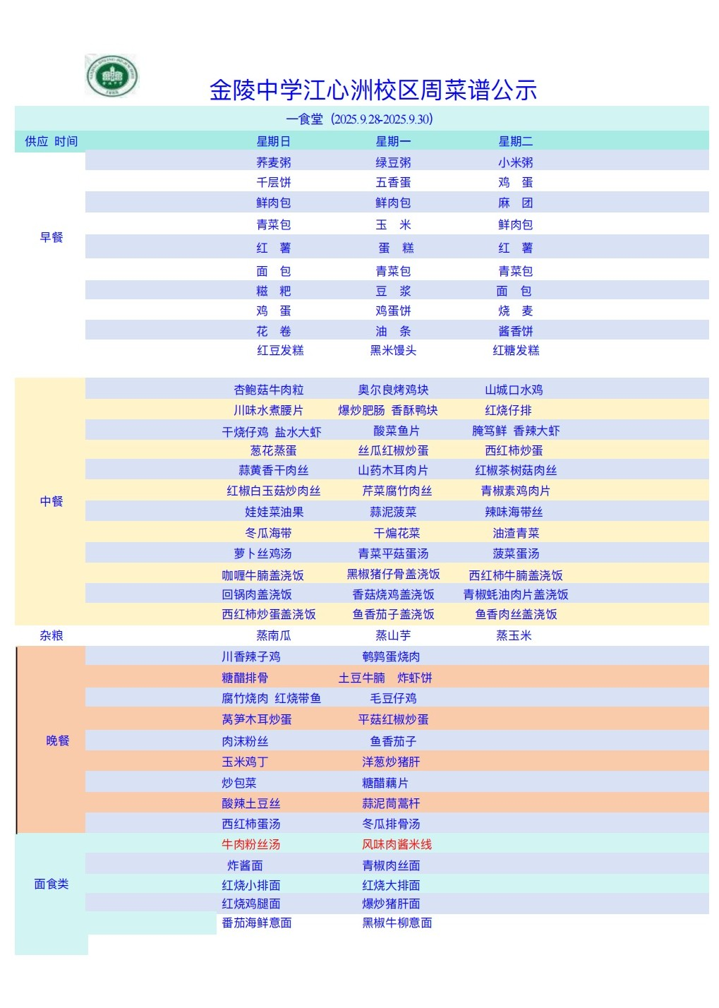 江心洲校区一周菜谱(2025.9.28—9.30)