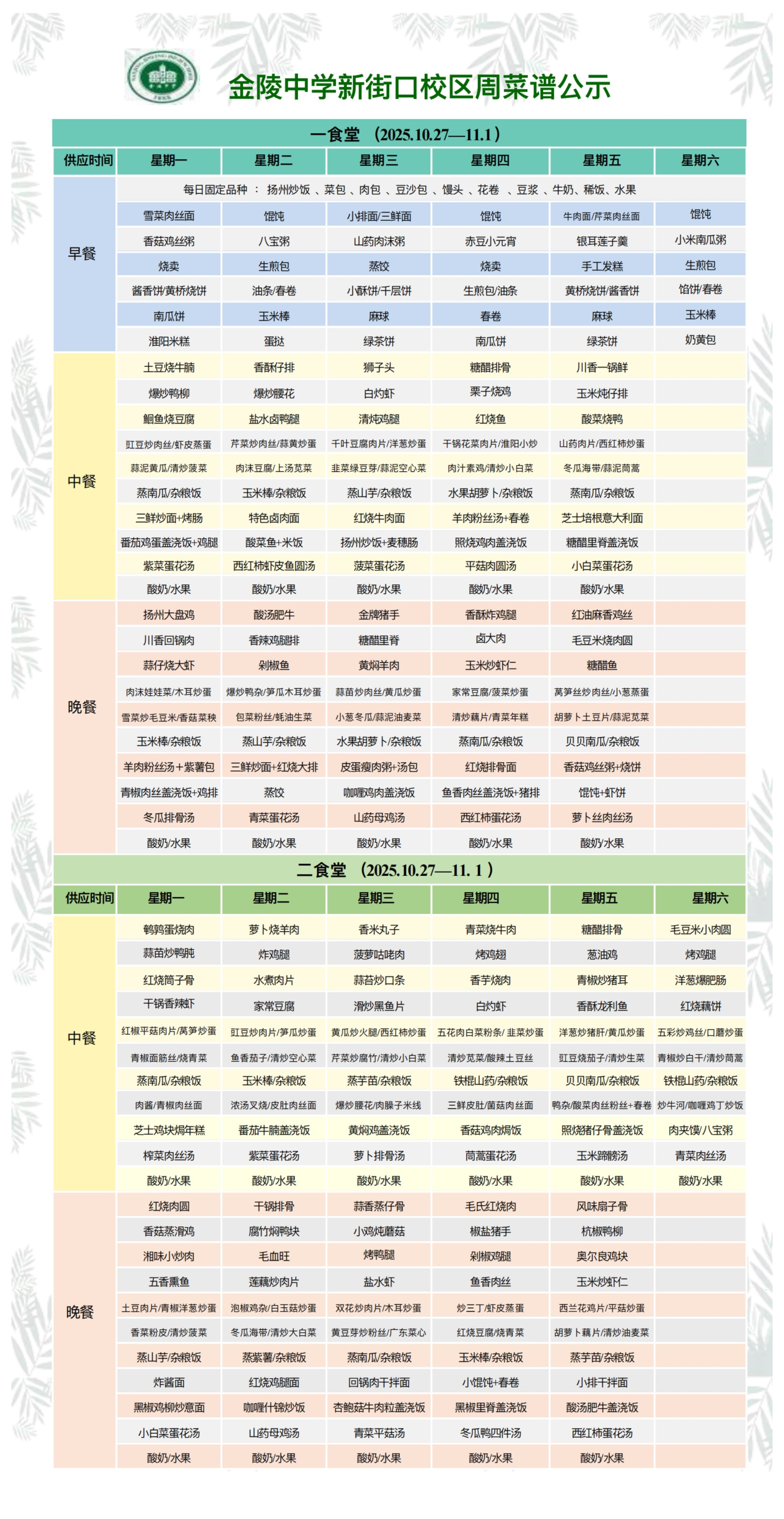 新街口校区一周菜谱(2025.10.27—11.1)